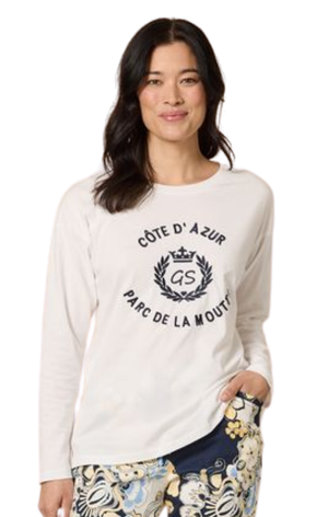 Embrace understated elegance with this Gordon Smith Côte d'Azur logo tee, a wardrobe essential that captures contemporary French aesthetic. The ivory base provides versatility, while the navy logo print and GS crest embroidery deliver refined detail without compromise. Constructed from premium cotton, the fabric delivers a luxurious hand feel and exceptional comfort for everyday wear. The classic crew neck cut suits both casual and smart-casual styling, pairing seamlessly with tailored trousers, denim, or printed separates for effortless sophistication.