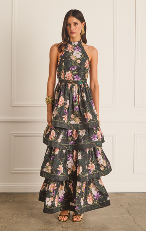 The Tempest Constance Dress by Aqua Blu Australia embodies timeless elegance with a striking print. This halter neck maxi dress features a captivating tiered tulip skirt that cascades gracefully. Crafted from a luxurious silk blend and fully lined for comfort, it epitomizes effortless sophistication for any occasion.