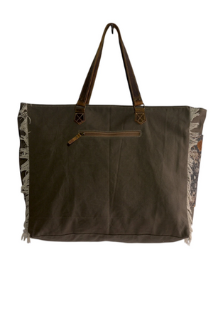 This weekender bag is meticulously crafted from a combination of cotton fabric, rug materials, and upcycled canvas, offering a unique fusion of textures and colors. It features a zip pocket on the back, a utility pocket in the main compartment, as well as a zip pocket and two slip pockets. The hardware has an antique finish, and the lining is made of polycotton.