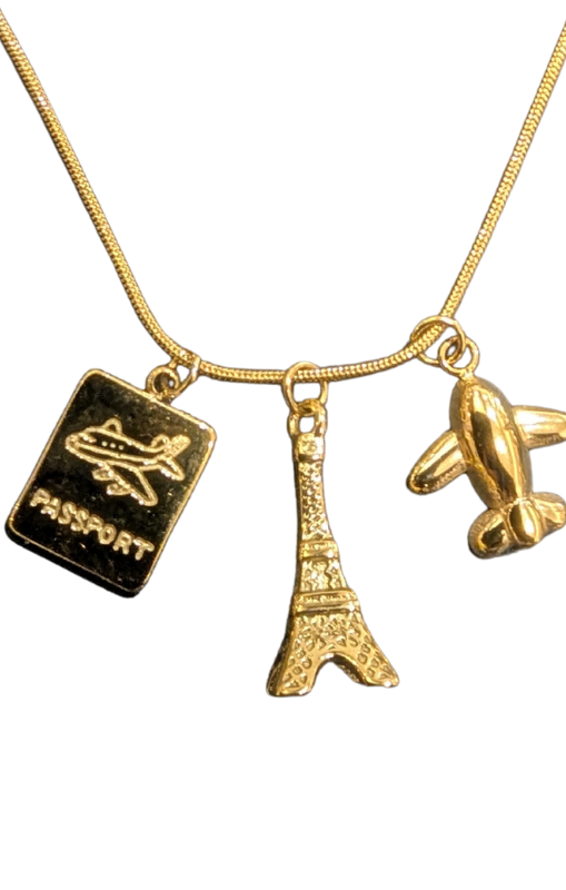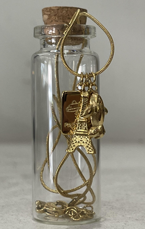 Jet-set in style with this adorable bon voyage necklace, featuring a miniature Eiffel Tower, passport, and plane charm nestled in a charming glass bottle. Perfect for wanderlust warriors and globe-trotters, it's the ideal send-off gift for anyone embarking on their next adventure. Wear your travel dreams close to your heart and let this playful piece spark conversations about all the amazing destinations waiting to be explored.