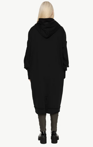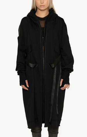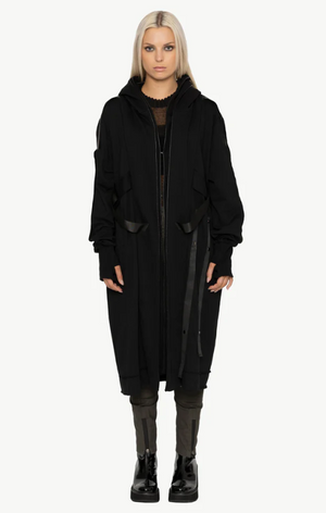 A midi length coat with hook closures, this coat offers full coverage and secure fit during movement. The two layered hood and lapels add a point of interest with straps and domes for a masculine finish. Keep your hands warm with thumb hole cuffs.