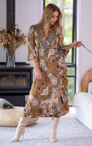 Donella Long Sleeve Wrap Dress stunning tones of gold and teal with a slight leopard print.