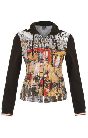 This jacket is a standout piece that combines fashion with art. This bestselling jacket features a beautiful cotton-blend knit that is both comfortable and flattering, making it an ideal choice for everyday wear. The attached hood with drawstrings and front zipper closure add practicality, while the long sleeves with jersey cuffs provide a snug fit. What truly sets this jacket apart is its artistic design, showcasing the work of renowned UK artist Paul Kenton. The vibrant print captures the essence of Parisian charm, ensuring you make a statement wherever you go. With contrasting details and stretchy fabric, this jacket not only offers spectacular style but also ease and versatility, proving to be a must-have in any wardrobe.