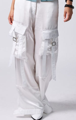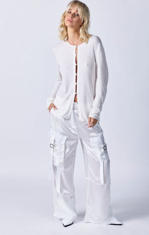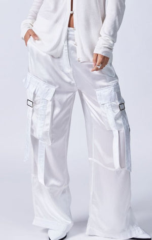The Tuned In Pant in black is crafted from lightweight fabric with a silky satin finish that creates an exquisite hand feel. The classic high rise and zip fastening make it comfortable to wear, while the elevated cargo pant design gives it timeless appeal that is further accentuated by the ribbon tie detail on the cargo flap pockets. A nod to the 90's with a luxurious spin, these wide leg trousers are perfect for enjoying the Summer months in style.