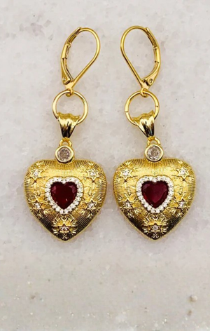 Vintage Ruby Cut Crystal Hearts centred in 18 Carat Gold-Filled Carved Hearts adorned with Stars. Simply Elegant and a Delight to Wear with any Outfit!