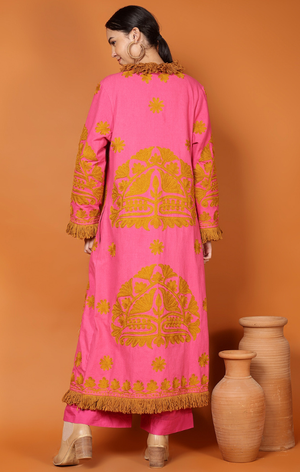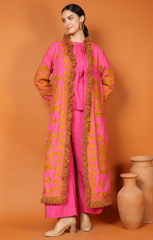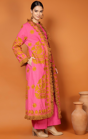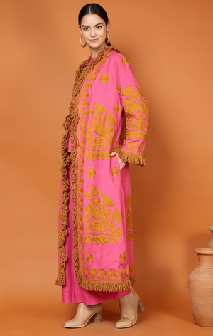Meet the Anannasa Adele Maxi Coat in pink—your new favourite layer that's equal parts chic and charming. This ankle-length coat wraps you in effortless elegance, with a flattering silhouette that turns heads wherever you go. The gorgeous pink shade brings a fresh, modern twist to ultra boho styling, proving that you have that certain je nais se qua which doesn't have to be serious. Beautifully constructed and designed to last, the Adele is the kind of piece that makes getting dressed feel like an adventure. Throw it on over anything and instantly elevate your look with personality and panache.