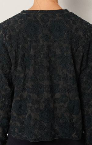 The floral embroidery rises from the base in quiet relief, intricate but not loud. The straight cut is softened by rounded hems and lightly padded shoulders, creating balance.