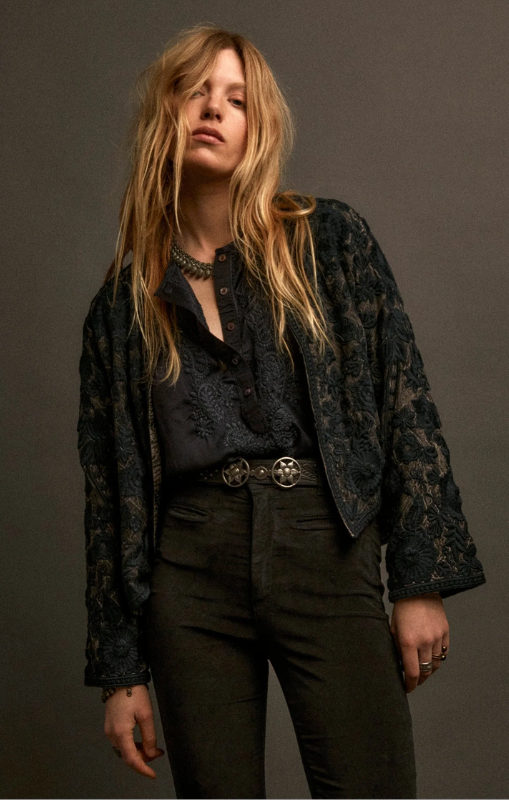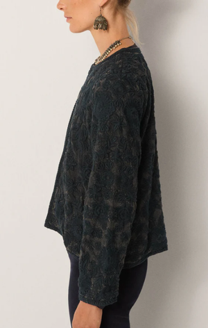 The fabric is weighty yet supple, falling with elegance while holding shape. Its dark ground and tonal stitching create a subtle, almost shadow–like presence.