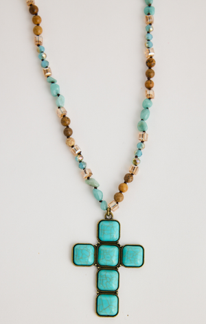 Chain - Glass Beads and 4mm Pic Jasper, Cross - Metal with Turquoise Stone