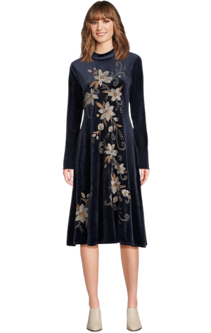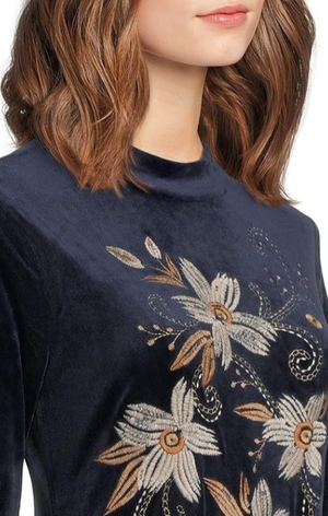 Slip into effortless elegance with this Johnny Was velour mock neck dress in midnight blue. Adorned with delicate floral embroidery that catches the light beautifully, it's the perfect piece for adding a touch of bohemian charm to your everyday wardrobe. The soft, luxurious velour fabric drapes gracefully while the intricate embroidered details elevate any occasion—from casual outings to special evenings. A timeless investment that feels as good as it looks.