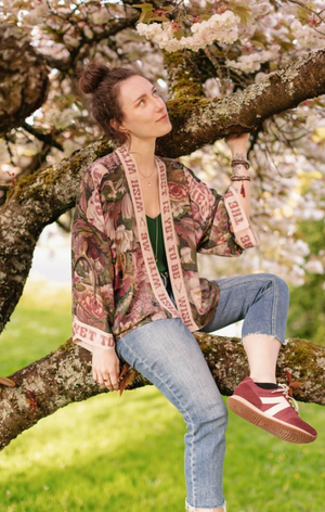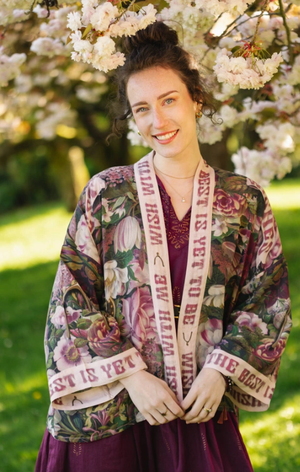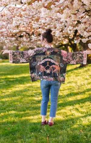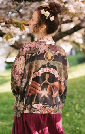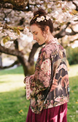Lighthearted, whimsical, and full of magic — this design was so much fun to create! We collaged several pieces of art from the eighteenth and nineteenth centuries that depict symbols of good luck — including a gold wishbone from a Victorian postcard, a coin design from 1840, an evening star, and a beautiful 1755 painting of a dandelion waiting to be wished on. The banners and words reading “Make a wish with me, the best is yet to be” and “Best Wishes” are adapted from an 1880’s lithograph, and the lilacs and spring flowers adorning the whole design are symbols of hope and renewal. May this piece bring you luck and joy whenever you wear it! 100% blended viscose. Machine wash gentle or handwash and hang to dry. Kimono measurements: length 60cm, width 74 cm across. Model is 5’5” for reference.