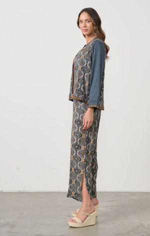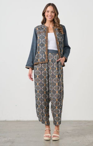 This amazing piece showcases authentic European design and style, featuring two distinct prints with a striking contrasting trim. It pairs perfectly with the Kosmos print pant, creating a coordinated and refined look. Equally, it complements denim jeans effortlessly, adding an elevated touch to casual wear. Beyond its style, the comfort factor of this jacket is exceptional, ensuring you feel as good as you look. To complete the look in the photo's, add a Caju White Tank top.