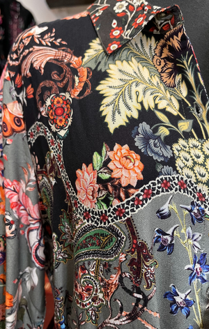 Step into effortless sophistication with the Cienna – Jolene Buttoned Dress, crafted from luxurious 100% viscose twill for a silky, fluid drape. This eye-catching midi dress features a vibrant floral and paisley print on a muted sage base, blending vintage charm with modern flair. Designed with a full button-down front, soft collar, and adjustable waist tie, it offers both comfort and versatility. Billowy sleeves add a touch of drama, while the detailed border hem gives it that signature boho finish. Dress it up with boots or down with sandals for a look that’s perfect year-round.