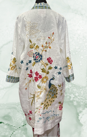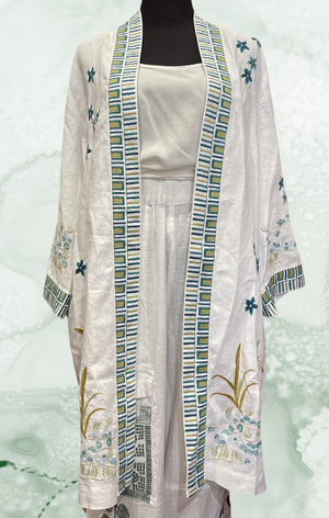 Crafted from 100% breathable linen, the Celina Linen Kimono Coat offers elevated elegance in a casual layering piece. Featuring an open front bordered with a mesmerizing design, this relaxed-fit kimono is finished with an ornately detailed embroidered scene at the back. Layer over a fitted top and silk palazzo pants for an iconic stylish ensemble.