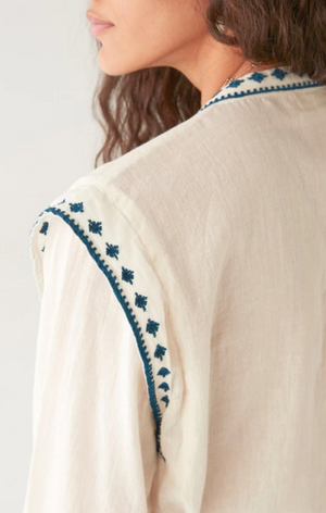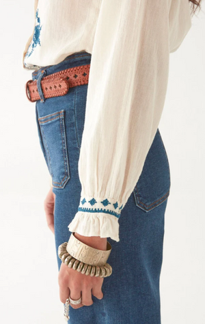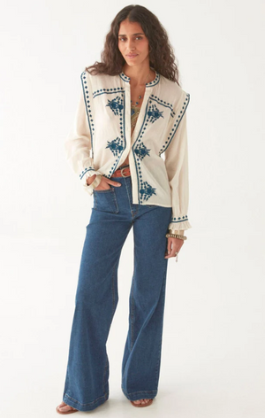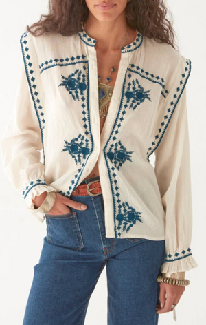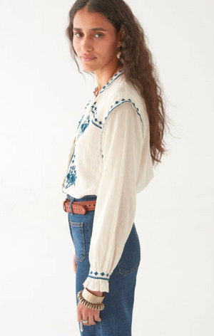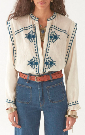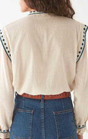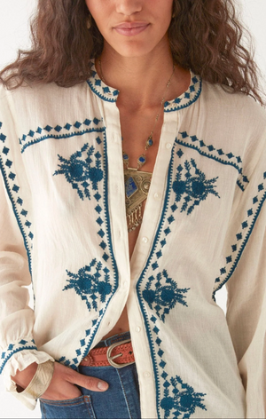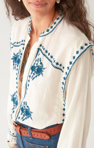 A deceptive little thing. That soft ivory cotton might suggest innocence, but the devil is in the details—razor-sharp indigo embroidery carving its way down the front, across the cuffs, and slicing through the Western yoke like it’s got something to say.