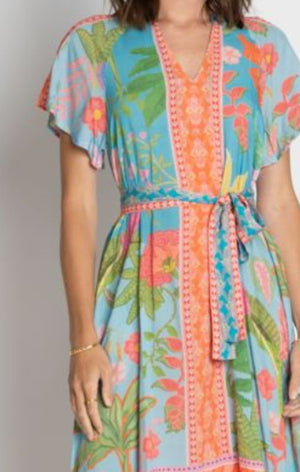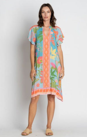 A V-neckline with a Nauru collar adds a chic twist, while the loose raglan sleeves fall gracefully to the elbows for an airy, feminine feel. The digital scarf placement print makes every piece unique—an artful blend of colour and pattern that captures the spirit of summer.