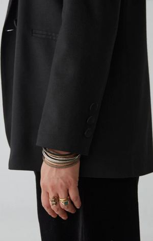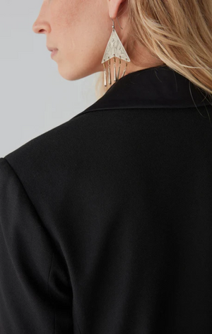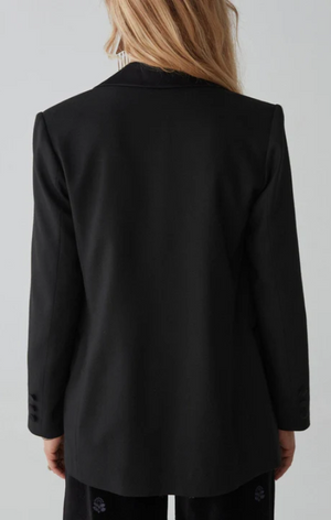 The deep, inky black fabric envelops you in a silhouette that’s both razor-sharp and effortlessly fluid. With its structured shoulders and sleek lapels, this piece is more than just evening wear - it's an embodiment of timeless allure and modern poise.