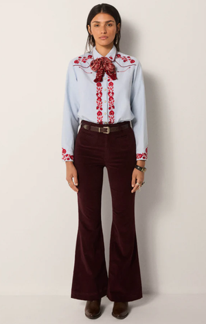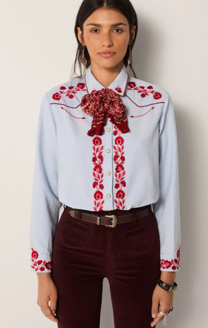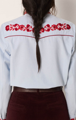 Delicate red floral embroidery covers the chest, cuffs and button placket, while snap buttons underline its Western reference. The contrast feels bold yet crafted.