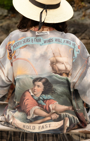 Created using an antique lithograph of a Victorian woman rowing through a storm — this print is a beautiful reminder of hope, tenacity, and strength. The image of a Brig ship is from an 1851 painting by Fitz Henry Lane, and the vintage lettering & seagulls are from a ship merchant advertising poster circa 1882. The rainbow & sun come from an antique postcard from the same era. For the trim, we reconstructed a 200-year-old textile fragment of suns, moons, and stars (origin unknown). The phrase “Hold Fast” — meaning “hold on tight, you’ll get through this” is a seafaring expression that sailors traditionally tattooed onto their knuckles, as talismans of protection to keep their grip on the rigging of the ship!