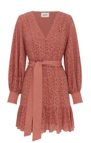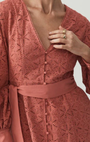 A beautiful feminine look, the Sara Mini Dress is a summer weekend essential. Feel effortless in this comfortable dress featuring a lace pattern embroidery, low v-neckline, button up front, high neckline, scalloped hem and elongated belt tie ~ pair with your favourite sandals when outfitting.