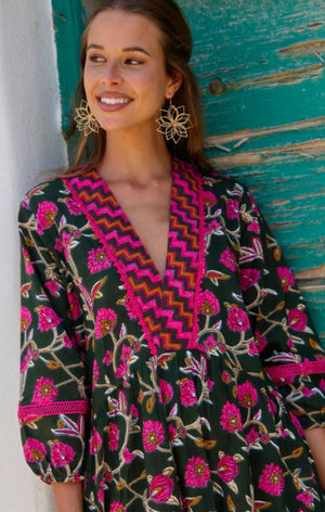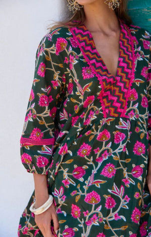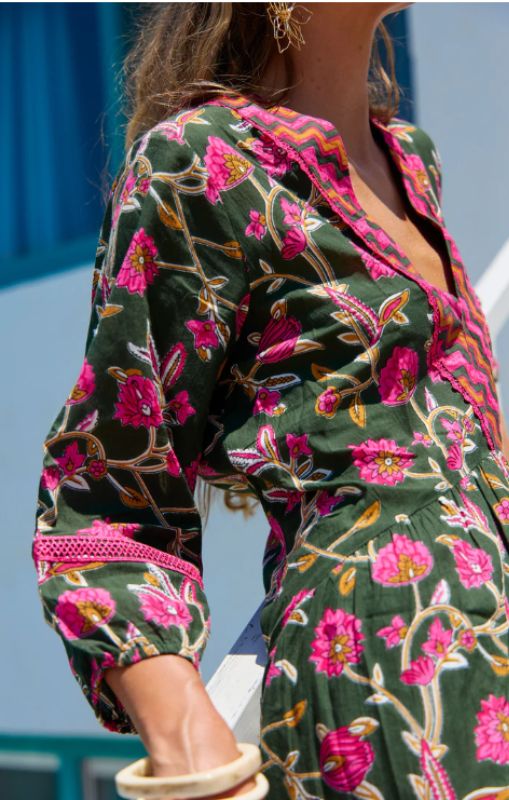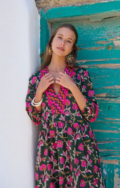 Every wardrobe deserves a dress as captivating as this one! It’s the exquisite detailing that sets it apart, while the harmonious color combinations in this pattern are nothing short of inspiring. This enchanting maxi dress showcases a long V-neck adorned with a contrasting trim that adds a touch of elegance. The 3/4 sleeves, gently elasticized just above the wrist, create a graceful bell shape that can be worn long or stylishly pushed up to the elbow, revealing a delicate pink trim insert that enhances its charm.