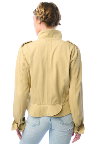 Slip into effortless elegance with this charming button-up jacket featuring delicate embroidered florals adorning the shoulders. Two practical front flap pockets keep essentials close, while a decorative brooch accent on the left pocket adds a touch of personality. Crafted from 100% cotton in a versatile olive tone, it's perfect for layering over your favourite pieces. Simply hand wash in warm water with similar colours and line dry for lasting wear.