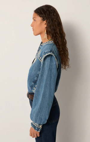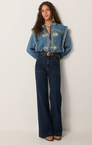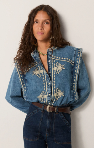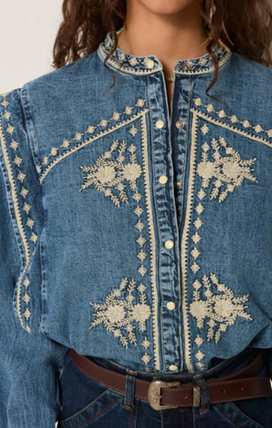 Across chest and sleeves, ivory florals unfurl like stitched gardens, adding delicacy to the rugged ground. The embroidery lightens the denim, lending movement and intricacy to a fabric built for endurance.