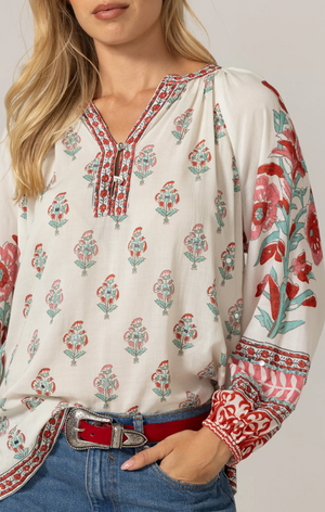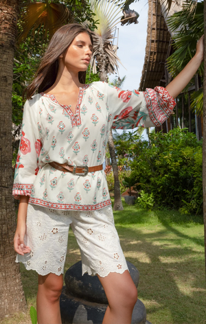 Crafted from 100% modal, the Vita Blouse is a lightweight, breathable top adorned with delicate embroidery for an artisanal finish. Featuring a relaxed silhouette, it boasts floral motifs in rich coral and teal tones, beautifully framed by embroidered borders at the neckline, sleeves, and hem. With its soft texture and elegant drape, this blouse pairs effortlessly with shorts or skirts for an easy, elevated look — perfect for warm days and relaxed escapes.