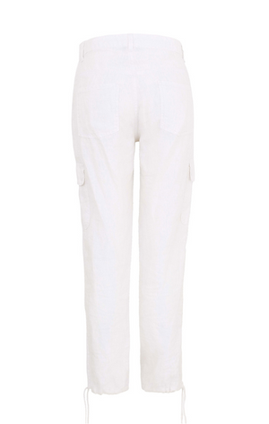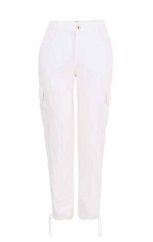 Dolcezza gorgeous 100% linen white pants in cargo style featuring the pockets, drawstring ties at hem, zipper and button closure, 7/8 ankle length, comfortable fit, woven fabric. Pair it together with the linen tops / jackets from the summer collection, exceptional style, indeed.