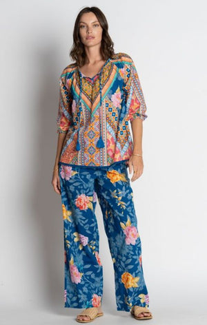 These cotton Danai Pants in Ocean offer effortless style with a simple pull-on design and an adjustable elastic waistband for comfort. Featuring two side pockets and a crisp finish, they provide versatility—pair them with the matching Danai top for a coordinated look, a crisp white shirt for smart casual or keep it super casual with a t-shirt or cami. Their sturdy yet stylish construction makes them ideal for travel, easily transitioning from joggers and sandals to heels for any smart casual occasion.