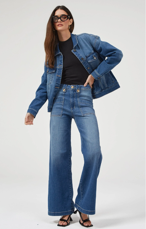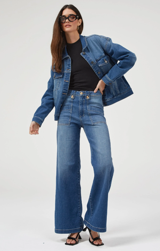 Piper Flare Leg Trousers has a 70's feel to it. These are crafted with comfort stretch denim. They sit high on the waist and have wider legs that subtly flare at the hem. The design features squared patch pockets, a horn button on the waist closure, and belt loops. These jeans are garment-washed, ensuring they are extra soft and comfy.