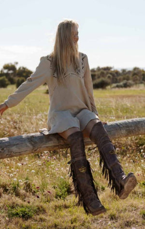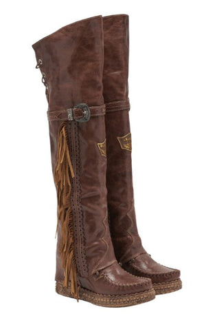 The Coleen boot is a must-have in the wardrobe of every loyal customer of El Vaquero brand. This double layered over-the-knee boot showcases the brand\'s signature handmade stitching on the instep, exquisite fringe detailing and an elegant lace-up back. Crafted with impeccable quality and attention to detail, the Coleen boot will enhance your look with sophistication and flair. Created in this new and amazing hand-made dyed cow leather, a delicate balance of colors and tones that gives the item a lived-in look and an unprecedented vintage effect, typical of El Vaquero brand.
