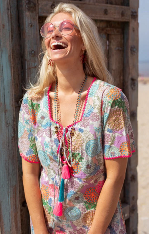 Effortlessly stylish, the Place du Soleil Rosa maxi dress features a bold floral print in green, blue, and pink. With short sleeves, a square neckline with a slit and tassel ties, and side seam slits, this lightweight dress is perfect for a day at the beach or a summer's day at home. Fun and playful, just like you!