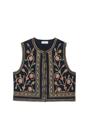 Cropped and sleeveless, built to layer, built to stand out. Buttoned up, it nods to old-world craft. Left undone, it’s pure rock and roll.