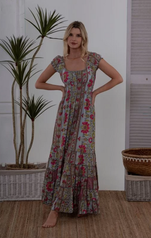 The Naomi Rosa Dress is one of our most popular maxi dress styles. Elastic shirring on the bodice, sleeves can be worn off the shoulder or on the shoulder. Gorgeous Aqua base with Hot Pink Floral Print and a bit of a gold shimmer.
