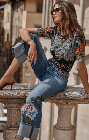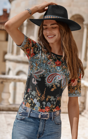 Thoughtfully embellished with an ornate pattern in a bold array of color, the Janie Favorite Boatneck Tee expresses personality and style. Designed with a boat neckline and 3/4 sleeves, this casual tee is finished with a fitted silhouette. Pair with linen shorts and fashion sneakers for a resort-inspired vacation look.