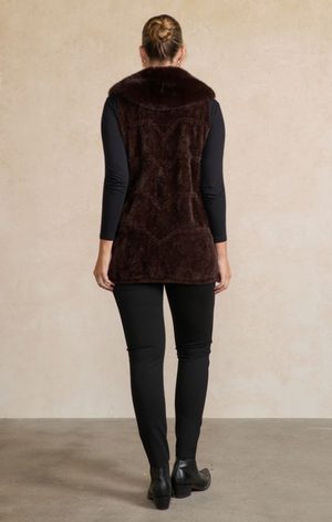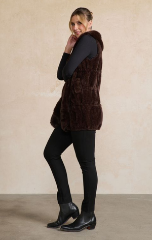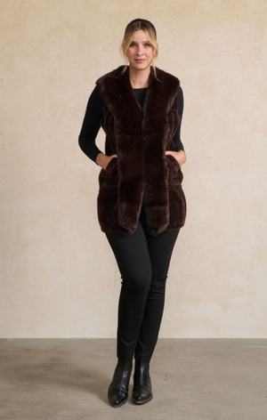 The Chrissy Vest by Holmes & Fallon is a luxuriously soft faux fur layer designed to add warmth and instant sophistication to your winter wardrobe. In a rich chocolate hue, its plush texture and flattering longline silhouette create an effortlessly elegant finish over even the simplest outfit.