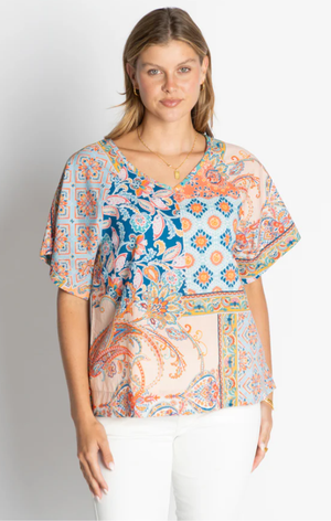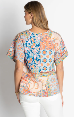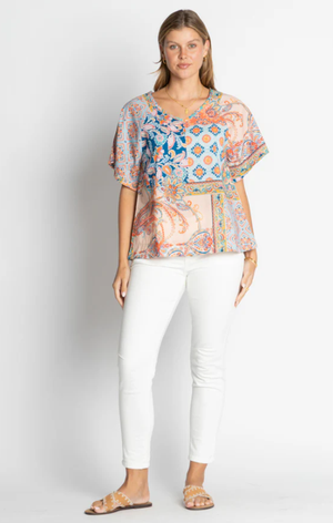 Experience relaxed sophistication with the IBSA Wisconsin Top, crafted from 100% cotton to ensure comfort throughout your day. This effortlessly stylish piece features a flattering V-neckline and wide raglan sleeves ending at the elbow, complemented by a bold digital print. Designed in Australia, it offers versatile styling options—pair it with jeans, skirts, or tailored pants for a modern, easygoing look that enhances your everyday wardrobe.