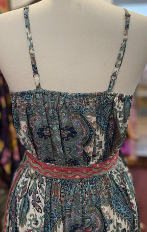 The is the perfect summer maxi, button detailing to the bodice with an elasticed waist with a long same fabric tie belt and two fabulous pockets in the side. This dress has spaghetti straps and is elasticated across the top of the back This dress really is the ultimate in perfect summer maxi's.