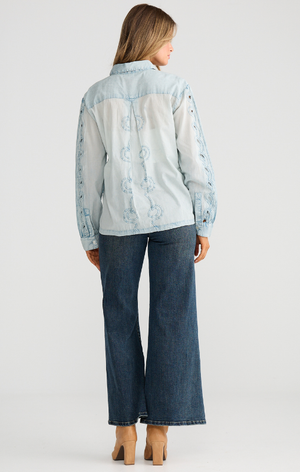 The Franklin Shirt is a timeless light blue essential featuring an open collared neckline and delicate embroidered voile detailing. Intricate embroidered patterns adorn the bodice and sleeves, while elegant cut-out motifs along the front centre and sleeves add contemporary flair. Crafted from 100% cotton for breathable comfort, this versatile piece transitions effortlessly from casual to dressed-up occasions. Available in sizes XS to XL with carefully graded proportions for the perfect fit.