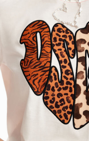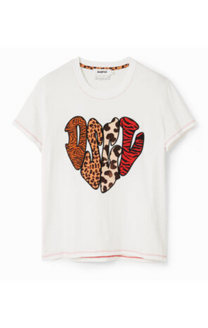 A short-sleeve T-shirt with front patches of letters in a heart shape with animal print.