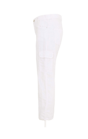 Dolcezza gorgeous 100% linen white pants in cargo style featuring the pockets, drawstring ties at hem, zipper and button closure, 7/8 ankle length, comfortable fit, woven fabric. Pair it together with the linen tops / jackets from the summer collection, exceptional style, indeed.