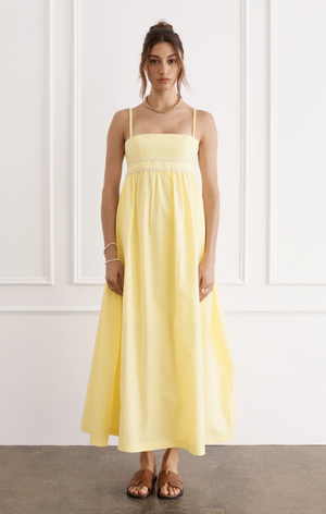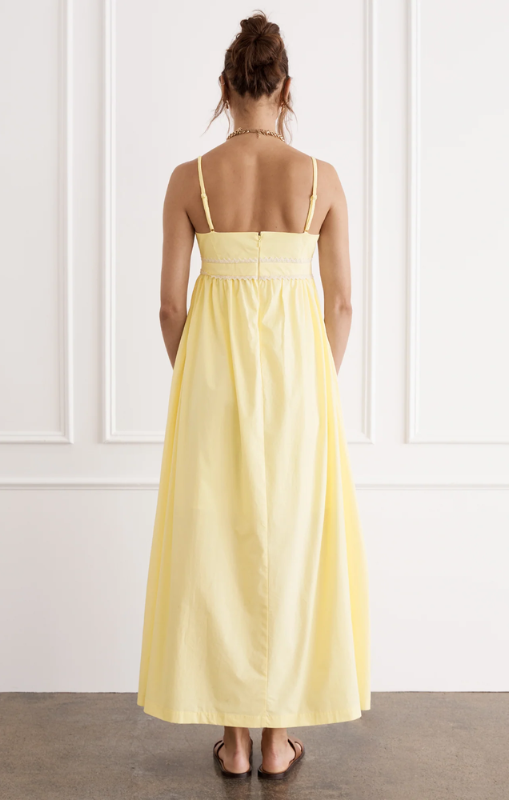 Crafted from 100% crisp Cotton Poplin, the Polly Maxi Dress in Limoné is the embodiment of summer romance. The cascading maxi skirt flows with effortless grace, with delicate self-tying shoulder straps that add a touch of feminine allure. A lace detail at the waistband is a nod to vintage softness. Created for gathering around a table with loved ones and twirling away into balmy summer evenings.