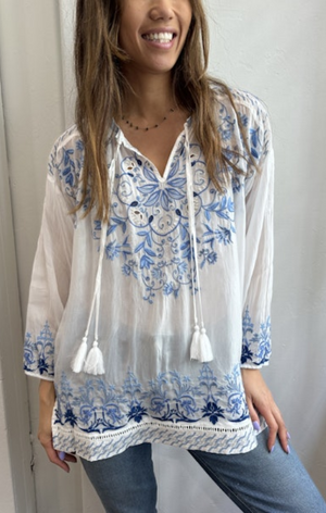 A soft V neckline is complemented by delicate self-tie tassels, adding a bohemian touch. The blouse is designed with drop shoulders and full-length sleeves, finished with matching embroidered detailing at the cuffs and hem. A ladder lace insert near the bottom hem enhances the airy silhouette, making this top perfect for both casual and elevated looks.
